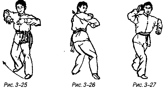 Из позиции для атаки швыряемой ладонью или позиции для разведки дороги рубящей ладонью (рис. 3-25) левая нога пройдя перед правой шагает вправо-назад, носок заворачивается внутрь, одновременно правая стопа разворачивается на передней части подошвы, корпус поворачивается вправо (рис. 3-26).