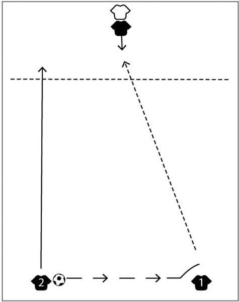Потребуется широкий участок поля 27 на 9 метров с секцией 9 на 10 метров на одной из сторон. Защитник должен находиться за спиной центрального нападающего до тех пор, пока ему не сделают передачу. Два атакующих игрока на противоположном участке поля пасуются в одно касание, пока кто-то из них не решит обработать мяч и отдать пас центральному нападающему. Его задача – сохранять позицию и правильно выбрать время для рывка назад. Опускаясь к мячу, он не должен покидать пределы секции, поэтому вынужден проявлять терпение и сдерживать защитника. После того как пас сделан, второй атакующий игрок бежит поддержать атаку. Забежав в секцию, он вместе с центральным нападающим разыгрывает выход 2 на 1, и они стараются завести мяч за лицевую линию. Если защитник отбирает мяч или мяч покидает пределы секции, игра заканчивается.