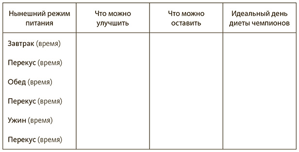 Используйте эту таблицу в соответствии с рекомендациями, данными мной в главе 8, чтобы создать меню идеального дня диеты чемпионов.