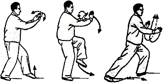 1. Немного развернуть корпус вправо (10 часов) и вести левую кисть пальцами вверх мимо правого запястья ладонью на себя. При этом правая рука остаются на месте. Одновременно с началом разведения кистей в стороны поднять левую стопу и сделать шаг вперед к 8 часам для левой позиции “лук-стрела”. Стопа устанавливается на пол развёрнутой носком наружу. Ладони направлены от себя. Смотреть перед собой (рис. 109—111).