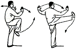 Обратить внимание: сохранять равновесие, при выносе правой стопы левая нога слегка согнута. “Мах” ногой “фокусирован” на пятке. Разведение рук координируется с выносом правой ноги. Правая рука над правой ногой. Руки слегка согнуты в локтях. В конечном положении направление на 9 часов.