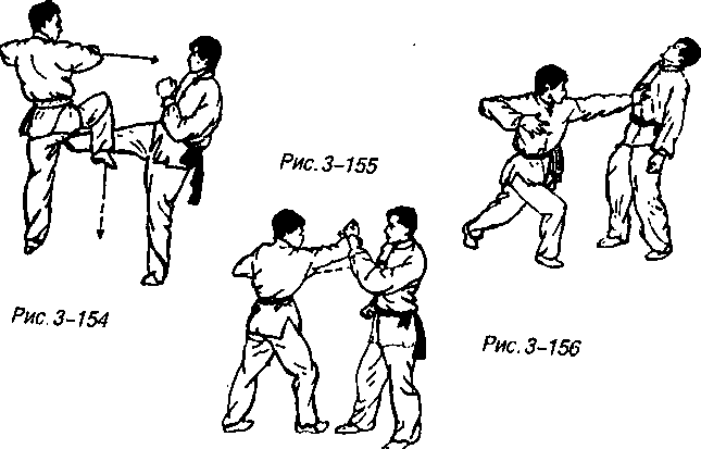 Из позиции для разведки дороги рубящей ладонью, когда противник, полностью перенеся вес тела на левую ногу, поднимает правую ногу и через правую сторону влево наносит поперечный сметающий удар мне по груди или ребрам, я тут же поворачиваюсь влево, одновременно поместив вертикальные предплечья перед грудью с краями локтевых костей в качестве точек приложения силы, блокирую удар противника (рис. 3-157, 3-158).