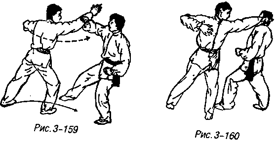Правая нога тут же делает шаг вперед, одновременно правая ладонь с внешним ребром ладони в качестве точки приложения силы через левую верхнюю зону наносит вправо-вниз диагональный рубящий удар по правой стороне шеи противника (рис. 3-159).