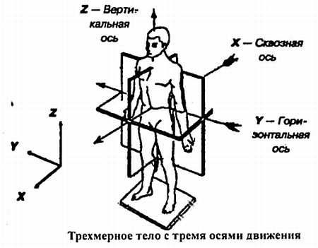 Движения человека происходят в трех измерениях. Чтобы изучить движения, сначала необходимо взглянуть на трехмерную модель. Полностью свободное движение, без каких либо ограничений, происходит вдоль трех плоскостей движения (осей). Ось X — вперед и назад, ось Y — вправо и влево, ось Z — вверх и вниз. Если у объекта одна точка фиксирована, он может вращаться вокруг всех трех осей, двигаясь свободно во всех трех плоскостях. В человеческом теле движения вокруг этих трех осей включают вращательные и круговые движения, которые вместе формируют шесть возможных рядов свободного движения:
