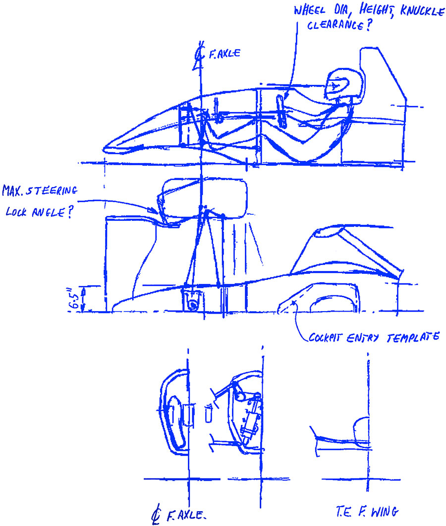 Когда дело доходило до разработки аэродинамики, я, как правило, рисовал все детали в размере модели, которая была в три раза меньше автомобиля (шаг вперед по сравнению с 25-процентной, с которой мы работали в аэродинамической трубе прежде), для того чтобы инженерам было проще вырезать мои бумажные чертежи и делать шаблоны для производителей моделей. Компоненты обычно были сделаны из дерева с основой из алюминия, хотя некоторые более тонкие детали, например переднее крыло, были изготовлены из углеродного волокна.