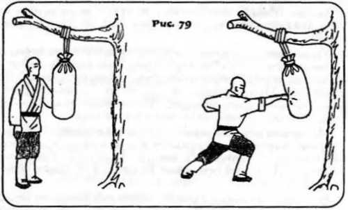 На первом этапе занятий с мешком посвящайте все занятие одному типу удара. Осваивайте удары в следующей последовательности: 1) чунчуй; 2) хэнчуй; 3) пэнчуй. Удары чаочуй, люсинчуй, цзачуй осваивают на шесте для ударов или на боксерской груше.
