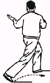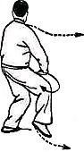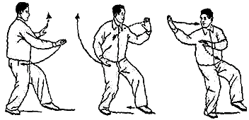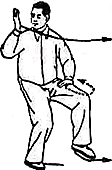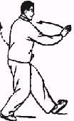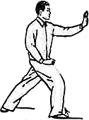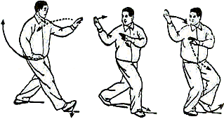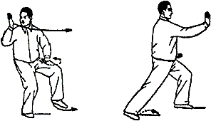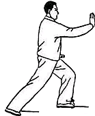 6. Повторить движения пункта 2 (рис. 36, 37). Обратите внимание: корпус” прямой, талия расслаблена; при “толкании” плечи и локти опущены. Движения кистей координируются с движениями талии и бедер. В позиции “лук-стрела” внутреннее расстояние между линиями пяток — около 30 сантиметров. В конечном положении направление на 9 часов.
