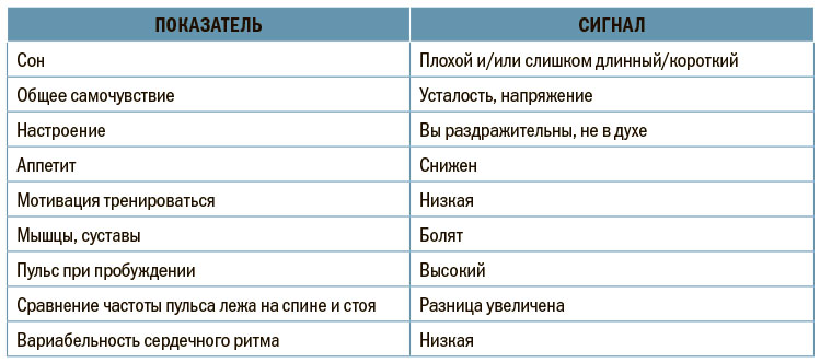Если отвечать коротко, то нет. Нет ничего, что позволит с полной уверенностью сказать: вы переходите свои границы. Есть лишь слабые признаки, по которым становится понятно: что-то не так. Я называю их «утренними сигналами», потому что они наиболее очевидны с утра, когда вы только просыпаетесь. Часто простая проверка нескольких из них помогает определить, насколько хорошо вы восстанавливаетесь. Иногда начнет казаться, будто что-то не так: вы заметите одновременно несколько симптомов. Конечно, даже если всё в полном порядке, вы грамотно тренируетесь и срыв вам не грозит, все равно можете заметить один из них. О том, что необходимо восстановиться и отдохнуть, скажут суммарно несколько признаков.
