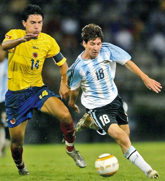 Лионель Месси обыгрывает полузащитника молодежной сборной Колумбии Абеля Агилара. В отличие от Месси Агилар так и не добился высоких достижений, завоевав единственное чемпионство в составе родного «Депортиво» (Кали) и сыграв за национальную команду на ЧМ-2014