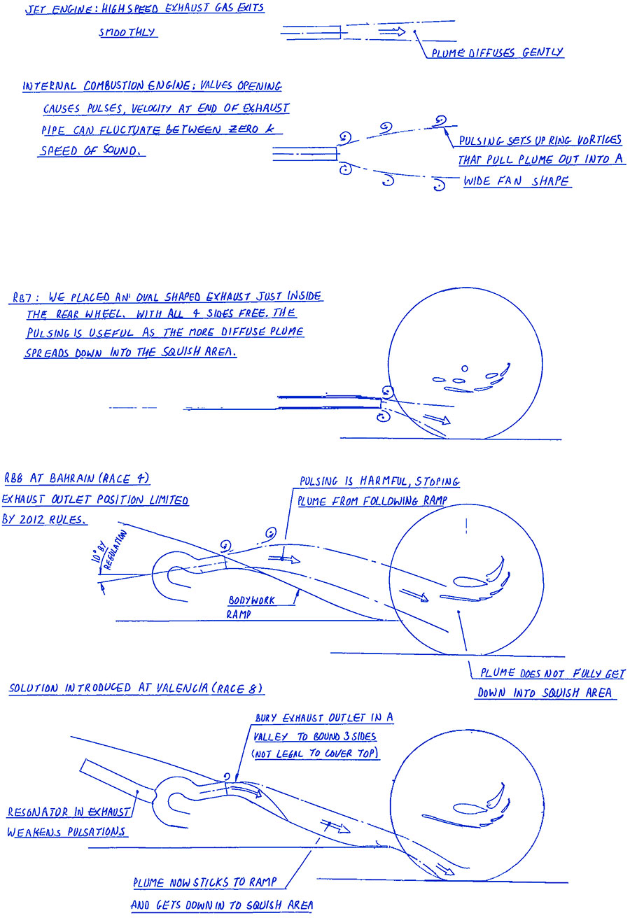 Новое шасси стало шагом в правильном направлении, но эффект от выхлопа на выходе из поворота выглядел гораздо слабее, чем в аэродинамической трубе или при анализе CFD. Объяснение, предложенное одним из наших специалистов по аэродинамике, Крейгом Скиннером, состояло в том, что это было вызвано пульсацией в выхлопе. Когда клапан цилиндра открывается, он создает ударную волну, и когда она достигает конца трубы, возникает ниспадающий кольцевой вихрь, формой напоминающий пончик. Подобные пульсирующие струи образовывались у крылатых ракет «Фау-1» времен Второй мировой войны. Крейгу удалось найти множество информации по этой теме, и он создал переходную модель CFD и применил ее к нашему шасси, и, конечно, стало ясно, что кольцевой вихрь выталкивал выхлопные газы из желоба на выходе из трубы, а потому лишь небольшая часть выхлопных газов добиралась туда, куда мы хотели их направить.