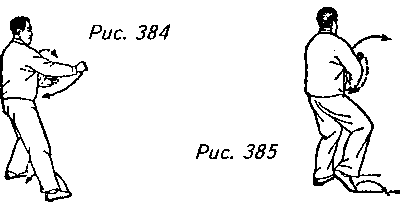 Движение 2: Поверните корпус тела вправо, выбросьте правый кулак тыльной стороной вниз, а левую руку опустите вдоль левого бедра ладонью наружу. Взгляд теперь должен быть обращен на правый кулак (рис. 386).