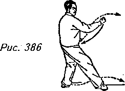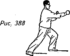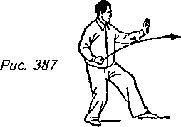 Движение 3: Перенесите центр тяжести своего тела вперед на правую ногу и шагните вперед левой ногой. Одновременно с этим переместите левую ладонь немного влево, затем вверх и вперед по закругленной траектории, поза должна соответствовать вашему желанию перехватить удар противника, ладонь направлена под углом вниз. Отведите правый кулак назад к правой стороне поясницы, держа его тыльной стороной вниз. Взгляд обращен на левую ладонь (рис. 387).