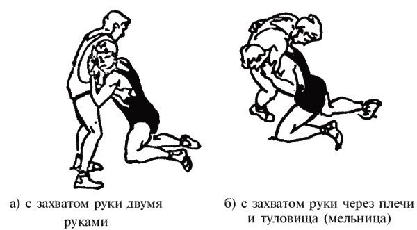 Сваливания сбиванием можно выполнять с различными захватами: за руку, за руку и туловище, за туловище, за руку и шею, за шею и туловище, захватом руки через плечи.