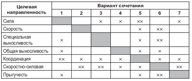 В число предпочтительных сочетаний вошли двигательные задания, направленные на последовательное воспитание: силовых и координационных способностей, скоростных качеств и взрывной силы рук, специальной выносливости и взрывной силы рук, взрывной силы рук и прыгучести.
