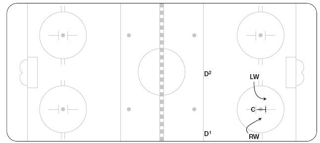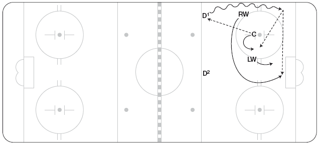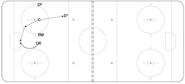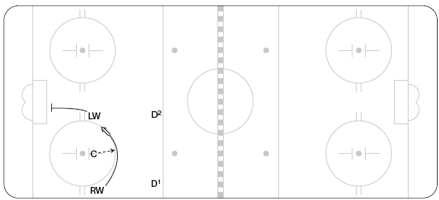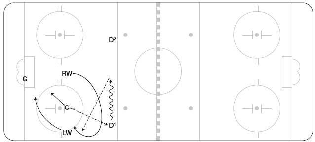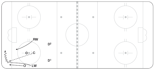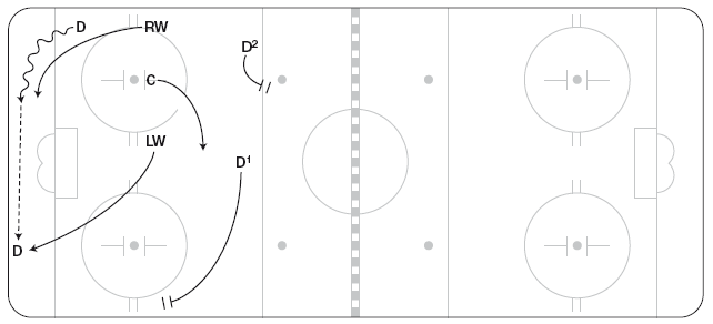 Проиграв вбрасывание, RW осуществляет жесткий прессинг в углу, вынуждая защищающегося игрока в районе ворот адресовать пас партнеру (рисунок 11.10). В случае передачи защитника коллеге по амплуа RW пересекает площадку либо за, либо перед воротами и применяет силовое давление. C готов перекрыть игру вдоль правого борта. Когда шайба перемещается на свободный край, он закрывает центральный проход. LW прикрывает дальний борт. D1 и D2 остаются в центре площадки и реагируют на пасы к середине.