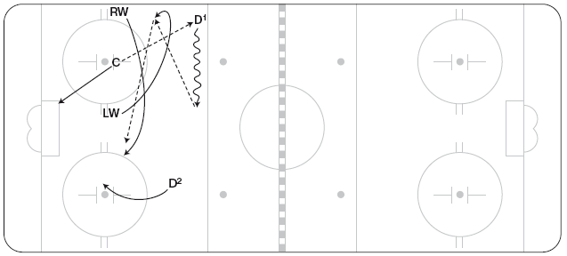 Проиграв вбрасывание, C перемещается выше в области пятачка (рисунок 11.9). RW совершает рывок через круг и прессингует защитника, который овладевает шайбой. RW должен убедиться, что тот, развернувшись, не устремится к центру площадки по сильному флангу. Вынудите обороняющегося игрока войти в зону прессинга, оттесняя его со свободного края. LW также стремительно бросается, чтобы перекрыть свободный край ворот и исключить возможность паса одного защитника другому. D1 готов подключиться к атаке во время передачи крайнему нападающему у дальнего борта. D2 остается в центре площадки для подстраховки.