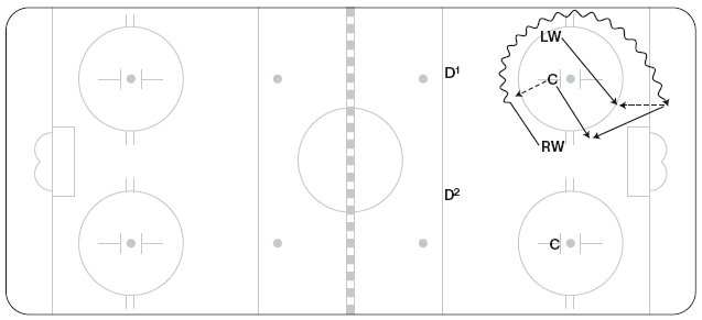 Такая комбинация предоставляет центральному нападающему множество возможностей, затрудняя опеку защищающейся команде. Некоторые команды попытаются совершить выброс шайбы мимо вашего игрока на синей линии. Исключите эту возможность, расположив находящегося внутри площадки крайнего нападающего немного позади, в коридоре. Вбрасывание по схеме «четверо от центра к краю» позволит центральному нападающему отбросить шайбу вперед, а затем выполнить пас одному из двух находящихся перед ним нападающих; отдать шайбу назад D1 для совершения броска из-под заслоняющего вратаря игрока; направить шайбу к борту, чтобы D2 совершил бросок или отдал пас D1. Эта комбинация часто используется, когда до конца матча или периода остаются секунды, поскольку она оканчивается быстрыми бросками по воротам с большим числом игроков перед линией ворот.