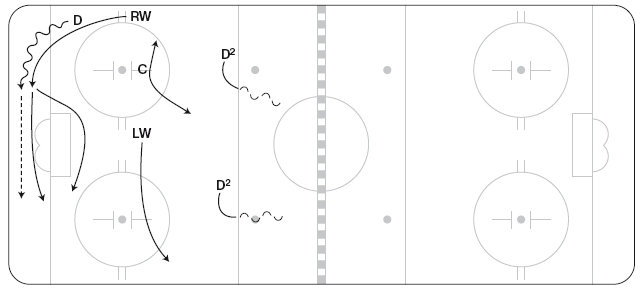 Начинается с прямого намерения выиграть вбрасывание, направив шайбу атакующему защитнику. Обороняющиеся игроки противостоят и/или пытаются заблокировать линию броска атакующему защитнику. Находящийся во внутренней части площадки правый нападающий заезжает в область над кругом у внешнего края длинного борта (рисунок 11.2). Центральный и левый нападающие резко устремляются к воротам. Цель атакующего защитника – отвести шайбу к центру площадки и сымитировать щелчок. Когда игроки обороны реагируют на этот финт, защитник передает пас вбок к находящемуся внутри зоны крайнему нападающему, который, в конце концов, осуществляет настоящий бросок по воротам через заслон.