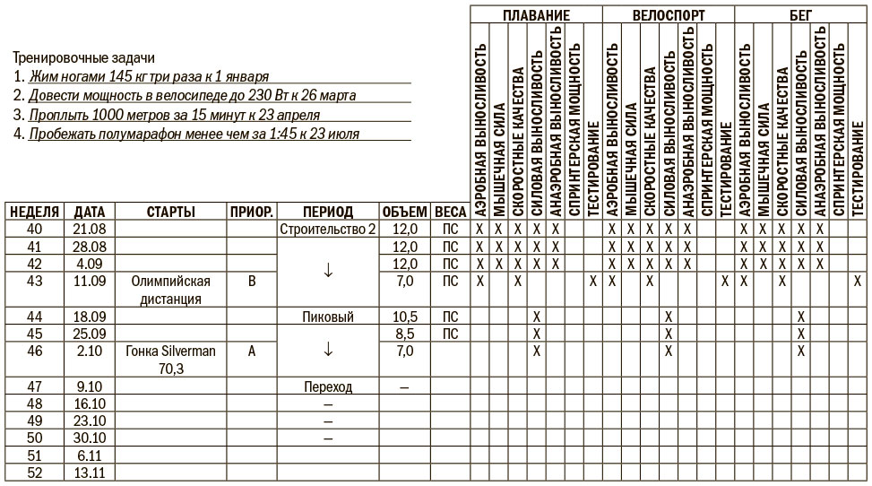 Заметьте, что в плане указана и спринтерская мощность для каждого вида спорта, но мы будем ее игнорировать, потому что для триатлона она малозначима.