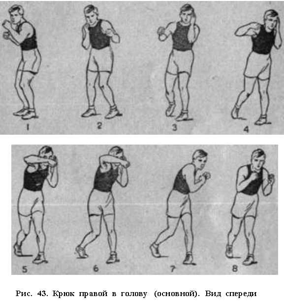 Направление удара может быть горизонтальным, а также направленным снизу вверх (нижний сбоку) и сверху вниз (верхний сбоку). Чем больше боксер отклоняет туловище вправо и назад, а вес тела смещает на правую ногу перед ударом, тем больше плоскость, в которой происходит движение удара, направляется снизу вверх, образуя форму удара, промежуточную между ударами снизу и сбоку. Но это относится лишь к началу движения. Дальнейшее направление удара зависит от величины шага (выпада) и степени сгиба левой ноги в колене. Чем значительнее выпад и чем больше боксер сгибает левую ногу в коленном суставе, отклоняя туловище вперед и влево, тем более наклонно сверху идет удар к цели. После удара правую ногу боксер либо оставляет на месте, либо подтягивает вперед в положение боевой позиции (рис. 43).