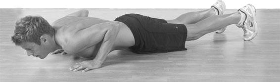 1. Поставьте ладони на пол примерно на ширине плеч, пальцы обращены строго вперед, руки выпрямлены, но не замкнуты в локтях. Отступите ногами назад так, чтобы тело образовало прямую линию от головы до стоп. Ноги раздвиньте примерно на 15 сантиметров. Вес тела приходится на носки стоп. Напрягите мышцы средней части тела, чтобы удержать спину от проседания; не сводите лопатки.