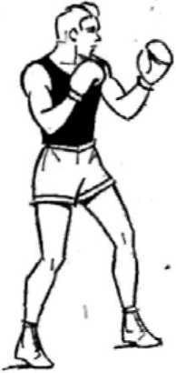 Кулак, повернутый тыльной стороной вправо-вверх, отставлен от подбородка примерно на 30—40 см. Левый локоть, отстоящий от туловища обычно на 10— 15 см, преграждает кулаку противника путь к сердцу. Кулак правой руки полусжат и находится справа от подбородка; локоть прикасается к туловищу и к тазовой кости и закрывает область печени. Голова наклонена вперед, подбородок прижат к левой ключице. Боксер смотрит на противника исподлобья.