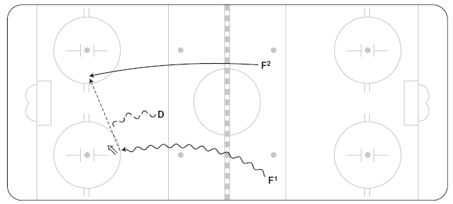 Независимо от того, на каком фланге находится владеющий шайбой игрок, он должен ввести шайбу в точку «тройной угрозы». Точка «тройной угрозы» – это такая позиция, когда владеющий шайбой игрок удерживает шайбу возле себя. Шайба готова к броску, при этом игрок может сделать и передачу, и бросок, и продолжить движение. Теперь ему нужно просчитать, как могут разыграть ситуацию защитники и вратарь, выбрав оптимальный вариант. У второго атакующего игрока клюшка должна быть готовой к броску или «подставке» для случайного рикошета в ворота.