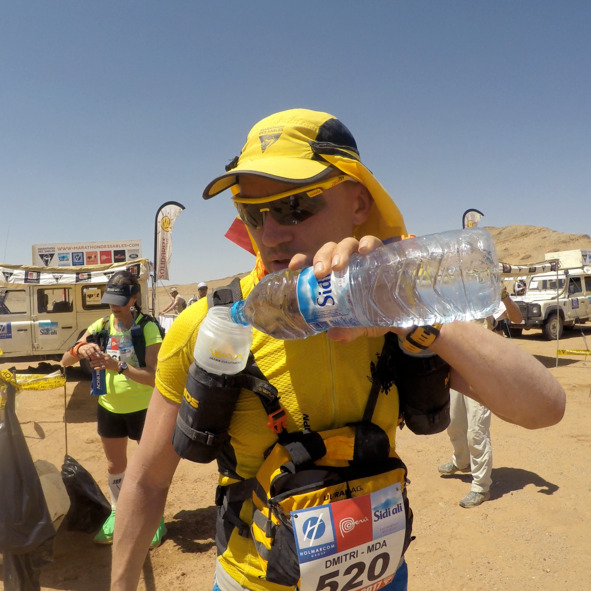 На горизонте появляется чек-поинт24. Подбегаю, мою пластмасску дырявят и спрашивают, сколько я хочу взять воды. На чек-поинтах можно выбирать, сколько воды будешь брать – либо полтора, либо три литра. Но… Если ты решаешь брать три литра, их придётся тащить на своем горбу до следующего пункта. Выкинешь бутылку в пустыне – получишь час штрафа к общему результату за весь ультрамарафон.