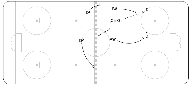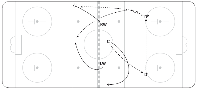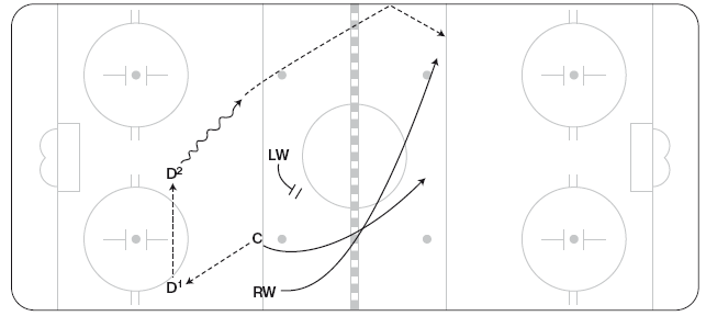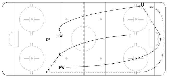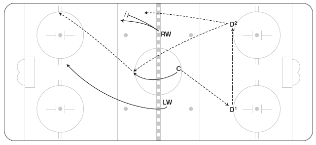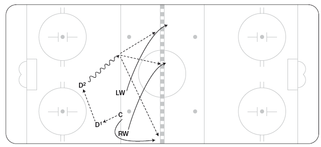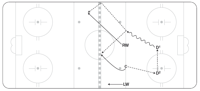C отбрасывает шайбу назад D1, а тот отдает пас D2 (рисунок 11.11). C, совершая широкий разворот, набирает скорость. RW совершает рывок к дальней синей линии. LW под углом устремляется к центру синей линии. D2 может отдать пас либо RW во время его перемещения, либо в центральный проход LW, либо на внешний край C. Кроме того, D2 может с шайбой пересечь красную линию и сделать вброс в зону нападения, где ее с внешнего края подхватит C.
