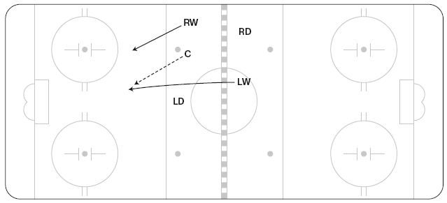 Выиграв вбрасывание, C разворачивается в противоположную сторону от паса, переданного от защитника защитнику (рисунок 11.16). LW устремляется к борту, а RW закрывает центральный проход. D2 может отдать пас LW или RW, однако его основной вариант – отправить шайбу на свободный край C, который набрал хорошую скорость.