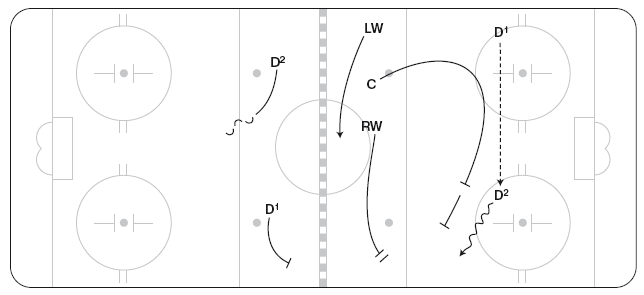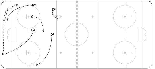 В случае проигранного вбрасывания крайний нападающий у борта (LW) вынуждает защищающихся игроков отдать пас поперек площадки из-под игроков (рисунок 11.19). C перекрывает середину льда. RW закрывает дальний борт. D1 и D2 плотно держатся в центре площадки.