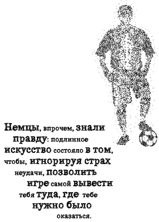 В 1974-м Визе выиграл Чемпионат мира для сборной Западной Германии. По крайней мере это сделал один из его игроков из «Айнтрахта». Ну типа того. «Это было моей идеей – сделать Бернда Хёльценбайна левым вингером, – вдруг говорит он. – В то время в Бундеслиге было много толковых правых вингеров. Ули Хенесс утюжил бровку от края до края, а Юрген Грабовски был богом навесных передач. Так что я сказал Бернду: послушай, а что, если ты начнешь заходить с левого фланга?» Визе выпрыгивает из своего кресла, расставляет ноги, готовясь пойти на воображаемого оппонента. Он опускает плечо и поворачивается в правую от себя сторону. «Когда смещаешься в центр с левого фланга, будучи правшой, ты идешь под слабую ногу правого защитника». Визе делает два шага вперед. Он разворачивается, представляя, что теперь он – защитник. Он бьет себя по левому бедру и делает такое лицо, как будто его только что «уделали». Теперь он снова нападающий. Ковер елозит туда-сюда. Он прицеливается. Правая тапка слетает с его ноги и ударяется о стену. 1:0, Визе.