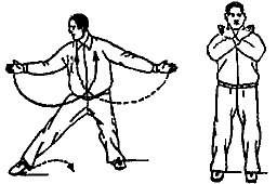 1. Согнув правую ногу, перенести на нее вес тела и повернуть корпус направо (1 час), пальцы левой стопы при этом развернув вовнутрь. Одновременно развести кисти по горизонтальной дуге в стороны ладонями наружу. Руки при этом чуть согнуты. Вес тела на правой ноге. Смотреть на правую кисть (рис. 168–169).