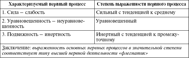 По общей сумме баллов для каждой части Анкеты (из строки «Сумма баллов») определить по шкалам степень выраженности нервных процессов и записать их в правую графу таблицы. Ниже приведен условный пример получения формулировки заключения. о типе высшей нервной деятельности.
