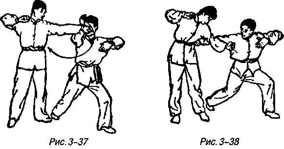 Из позиции для атаки швыряемой ладонью, когда противник наносит левым кулаком прямой удар мне в лицо, я правой ногой тут же шагаю вправо-вперед, одновременно поворачиваю корпус влево, вертикальное правое предплечье с внешним краем локтевой кости в качестве точки приложения силы поворачиваясь вокруг своей оси наружу выполняет подвеску влево по руке противника (либо отталкивает ее ладонью) (рис. 3-37).