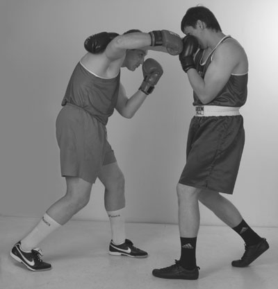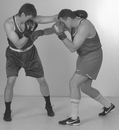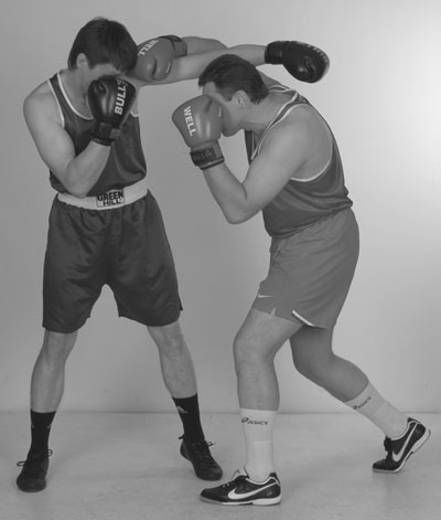 На удар противника в голову передней или задней рукой вкручиваемся вниз, шагая немного вперед на переднюю ногу, разворачиваем заднюю часть тела и выбрасываем вперед и немного вниз дальнюю руку. Проталкиваем локтем кулак под грудную мышцу противника. Передняя рука у головы. Фото 86, 87.
