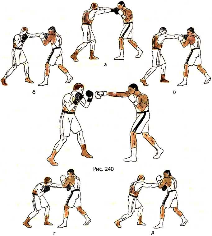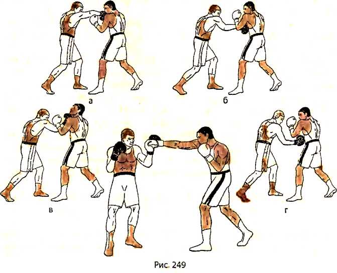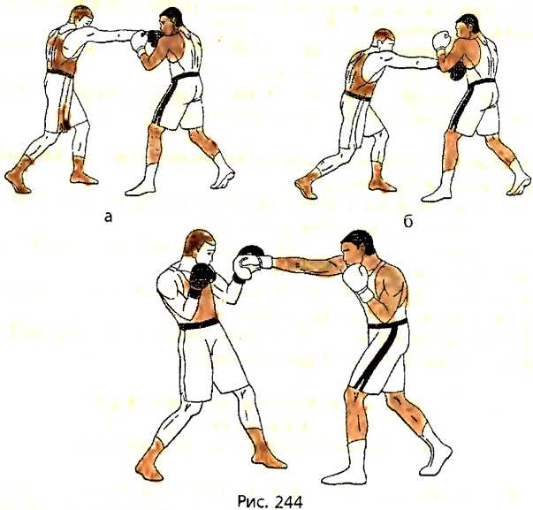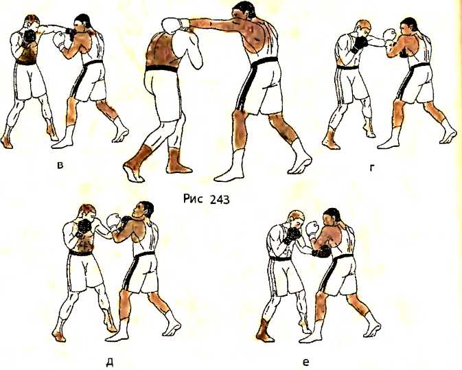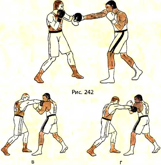 В ответ на прямой удар правой рукой в голову со стороны противника, убирая голову из-под удара движением влево, выполняем уклон влево вперед под удар, разворачивая свое туловище справа налево, прикрывая правым плечом свой подбородок справа и слегка сгибая ноги в коленях (рис. 243 - вид справа).