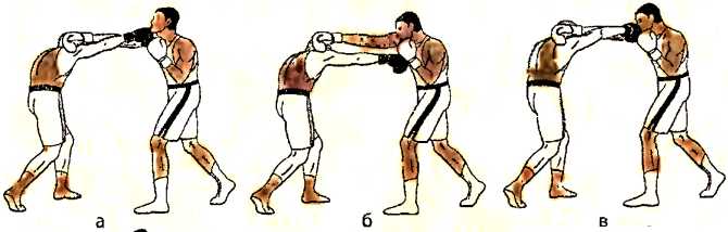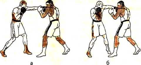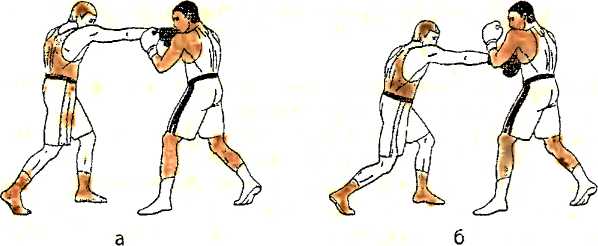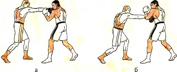 а ) одновременно с уклоном влево вперед, наносим встречный прямой удар правой рукой в туловище противника;