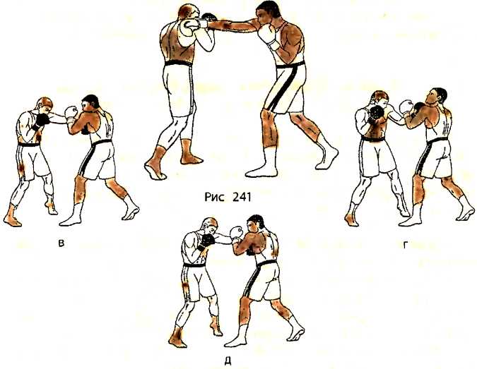 д ) отталкиваемся правой ногой и, одновременно с шагом левойногой вперед, наносим ответный прямой удар правой рукой в туловище противника.