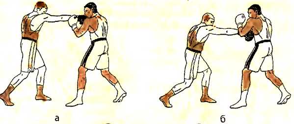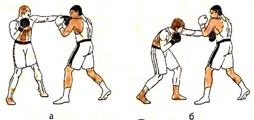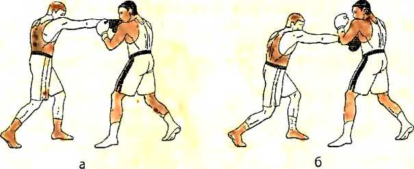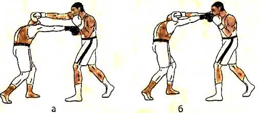б ) отталкиваемся левой ногой и. одновременно с шагом левой ногой вперед, наносим ответный прямой удар левой рукой в туловище противника;