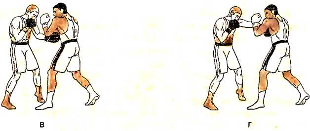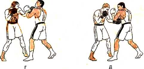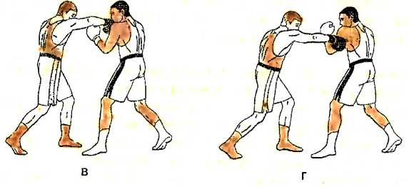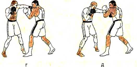 г ) роняем правый кулак вниз, а затем, отталкиваясь правой ногой, наносим ответный удар снизу правой рукой в туловище противника одновременно с постановкой левой ноги в удобное положение;
