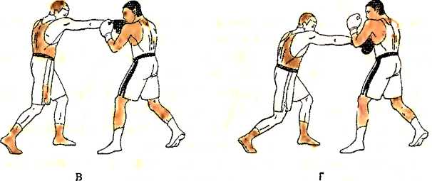 в ) одновременно с выпадом и уклоном влево вперед, наносим встречный боковой удар правой рукой в голову противника;
