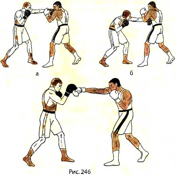 В ответ на прямой удар правой рукой в голову со стороны противника, отталкиваемся левой ногой и, отклоняясь туловищем назад, делаем шаг правой ногой назад (рис. 245 - вид справа ). Как только правая нога получает опору, тут же подтягиваем к ней левую ногу.