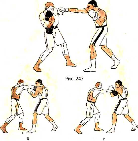 В ответ на прямой удар правой рукой в голову со стороны противника, отталкиваемся левой ногой и приподнимаем левое плечо вверх, подставляя его под удар противника, делаем шаг назад (рис. 247 - вид справа).