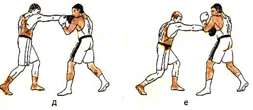 д) отталкиваемся правой ногой и, с переносом веса тела на левую ногу, наносим ответный прямой удар правой рукой в голову противника;