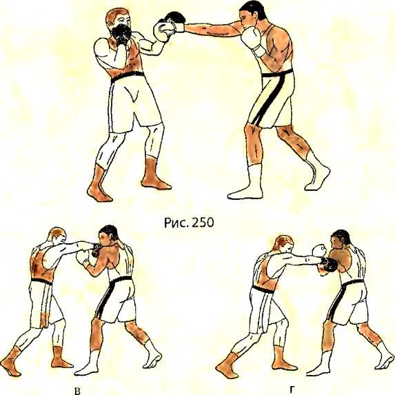В ответ на прямой удар правой рукой в голову со стороны противника, убирая голову из-под удара уклоном влево назад, одновременно сбиваем левой ладонью наносящую удар правую руку противника в сторону вправо (рис. 250 - вид справа).