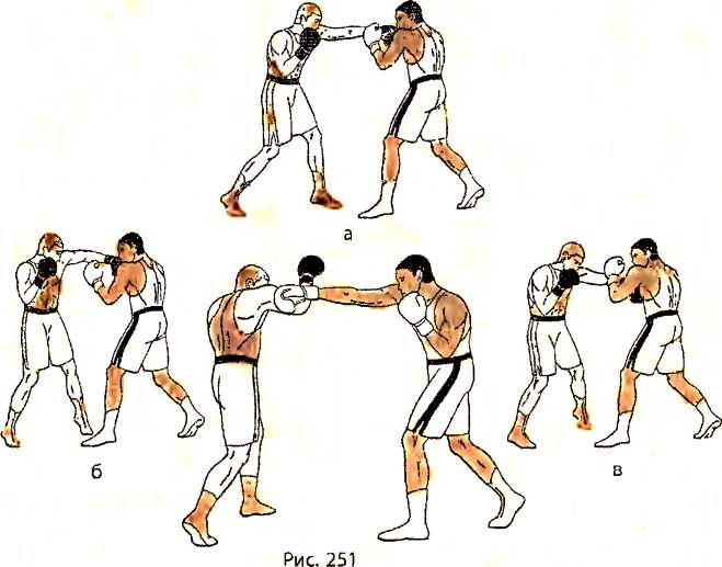 В ответ на прямой удар правой рукой в голову со стороны противника, убирая голову из-под удара движением влево, отталкиваемся правой ногой и делаем шаг левой ногой в сторону влево с переносом веса тела на левую ногу, одновременно отбивая своим левым предплечьем наносящую удар руку противника в сторону вправо (рис. 251 - вид сбоку).
