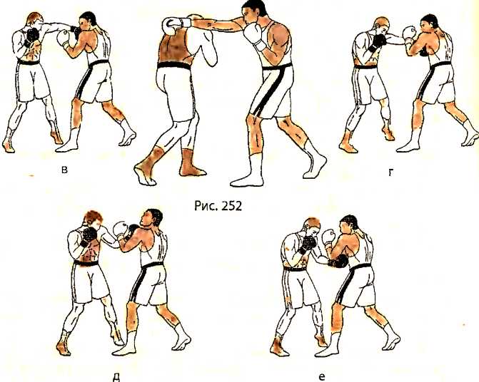 В ответ на прямой удар правой рукой в голову со стороны противника, убирая голову из-под удара уклоном влево, одновременно отталкиваемся правой ногой и делаем шаг левой ногой в сторону влево, перенося вес тела на левую ногу, с последующим подтягиванием правой ноги к левой ноге (рис. 252 - вид справа).