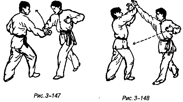 Тут же правая рука следуя ситуации идет вперед-вверх и с тыльной стороной кисти в качестве точки приложения силы запрокинутой ладонью наносит швыряемый удар по лицу противника (рис. 3-148).