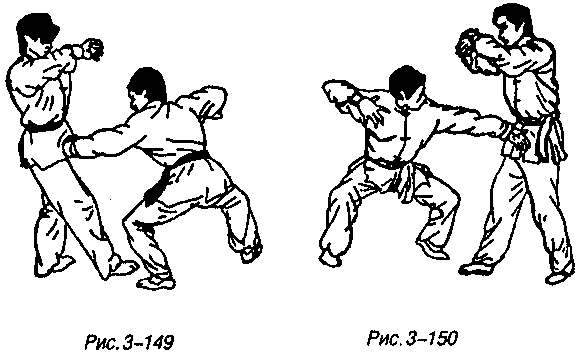 Если противник подпирает рукой, я тут же поворачиваюсь вправо принимая мабу, одновременно левой ладонью с тыльной стороной кисти в качестве точки приложения силы наношу резкий швыряемый удар в промежность противника (рис. 3-149, 3-150).